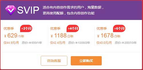 從5118大數(shù)據(jù)官網(wǎng)了解到,可以使用5118智能原創(chuàng)功能的是SVIP會員、活動優(yōu)惠價629元/年、還送兩個月使用時長。如果一次購買兩年只需要1188元,再送4個月使用時長,如下圖所示: