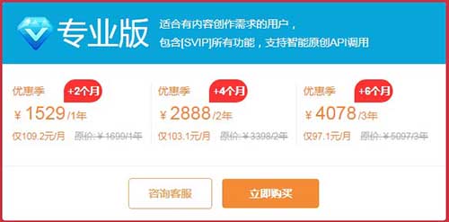 除了SVIP會員可以使用智能原創(chuàng)功能以外,還可以購買專業(yè)版5118會員。專業(yè)版5118會員也可以使用5118智能原創(chuàng)功能,他包括了SVIP版會員所有功能,并增加了營銷情報中心。專業(yè)版5118會員需要1529元/年、并送2個月使用時長;專業(yè)版5118會員可以一次購買2年、3年,購買越久價格越優(yōu)惠,如下圖所示: