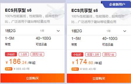 理論來說,阿里云所有的云服務器都可以用于中小企業(yè)網(wǎng)站,只是新企業(yè)用戶購買阿里云企業(yè)服務器,要比普通用戶要優(yōu)惠。比如:阿里云ECS共享型s6服務器,普通用戶購買需要186.24元/年;企業(yè)用戶購買只需要174.60元/年,如下圖所示: