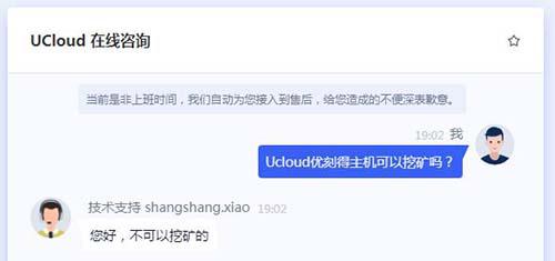 上面只是網(wǎng)友之間的討論,并非官方的答案。小站筆記為了得到準(zhǔn)確的答案,特地去咨詢了Ucloud優(yōu)刻得官方客服,得到的答案是:Ucloud優(yōu)刻得云主機(jī),不可以挖礦!如下圖所示: