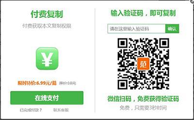 如何獲得第一范文網(wǎng)驗證碼?我們在復制第一范文網(wǎng)的文章內(nèi)容時,會彈出一個提示窗口要求:一是付6.99元下載文章;二是用手機微信掃碼獲取第一范文網(wǎng)驗證碼。因此,想要獲得第一范文網(wǎng)驗證碼就需要用微信掃一掃、關(guān)注第一范文網(wǎng)微信公眾號即可,如下圖所示: