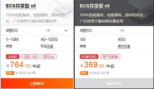 通過阿里云官網(wǎng)了解到,阿里云ECS共享型4核8G1M配置的服務(wù)器,平時新用戶價是764.52元/年、618促銷活動價格是369.90元/年,如下圖所示: