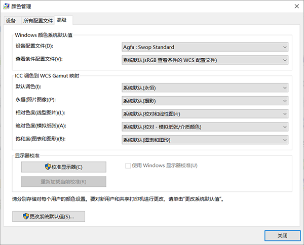 打開電腦“控制面板”,點(diǎn)擊“顏色管理”->再選擇“高級”-> 將【設(shè)備配置文件】更改為:【Agfa:Swop Standard】即可。如下圖所示:
