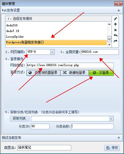 (1)網(wǎng)頁編碼:UTF-8;(2)全局變量:你設(shè)置的密碼;(3)網(wǎng)站地址:你的域名/Locoy.php;(3)登錄方式:不登錄。設(shè)置好后點(diǎn)擊獲取列表,選擇需要發(fā)布的欄目下即可。