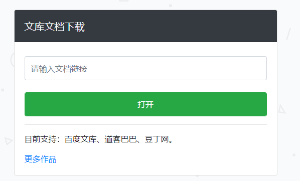 網(wǎng)頁端用起來就更方便了,只需要用瀏覽器訪問,隨時(shí)隨地即可使用,目前支持百度文庫、道客巴巴、豆丁網(wǎng)中文檔的解析下載,覆蓋面更廣,適用性更高!