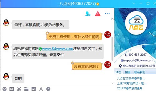 2.由于八點云免費虛擬主機是國內(nèi)機房,所以使用前網(wǎng)站域名必須備案才能使用!從八點云在線QQ客服咨詢了解到,八點云提供免費備案服務(wù)。