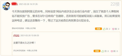 Boke112聯(lián)盟站長(zhǎng)在盧松松博客中留言提到:收到阿里云的電話,說是“網(wǎng)站內(nèi)容涉及企業(yè)或行業(yè)內(nèi)容”,要求在3月1日前整改完成。如下圖所示: