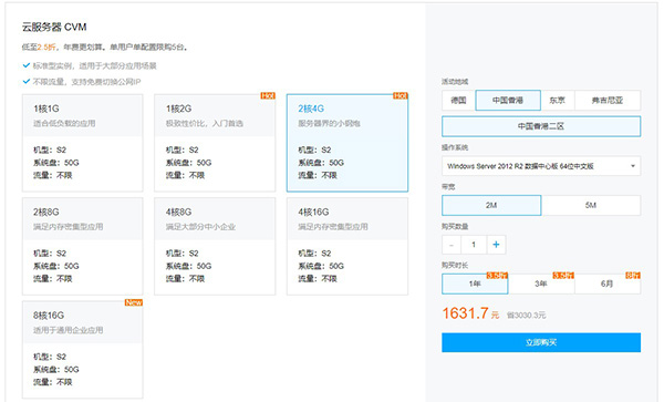 在騰訊云全球云服務(wù)器活動(dòng)頁(yè)面中的“新老用戶(hù)同享”,即可看到有7種不同規(guī)格的免備案云服務(wù)器CVM,分別為1核1G、1核2G、2核4G、2核8G、4核8G、4核16G、8核16G,都有中國(guó)香港的地域可選,帶寬和時(shí)長(zhǎng)也可選,所以中國(guó)香港服務(wù)器的價(jià)格是不固定的,跟你所選擇的配置有關(guān)。比如下圖所示的1核2G云服務(wù)器S2,選擇中國(guó)香港二區(qū)、1M帶寬,購(gòu)買(mǎi)1年的價(jià)格就是657.3元。